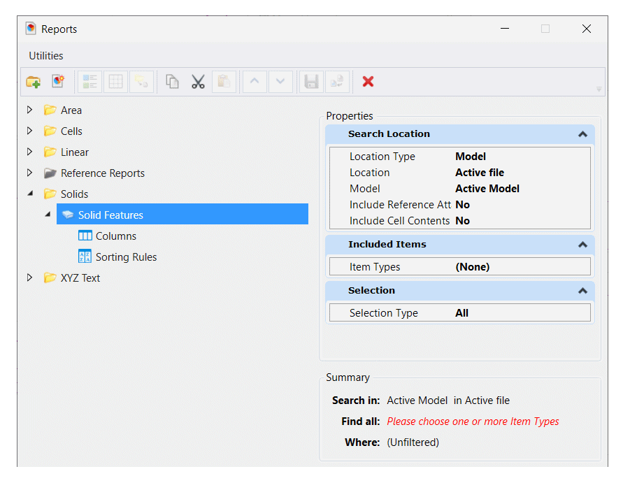 This is where the user interface is confusing. We want to report information about 3D constructs and other elements, which are a type of DGN element. The Report definition form is asking for a Search Location and Included Items. Leaving Search Location as it is (collect information from the active model in the active file), focus on Included Items.